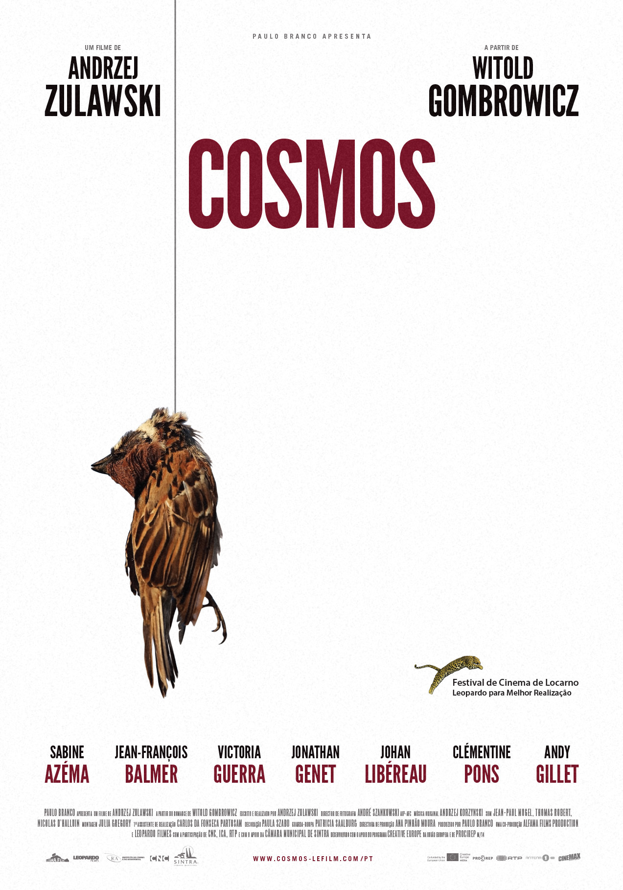 Key art for the film 'Cosmos' by Andrzej Zulawski. Cosmos is an adaptation of Polish author Witold Gombrowicz’s 1965 novel, in which a pair of well-off young men arrive at a small-town hostel to spend a few days. There, they are welcomed by a sparrow hanging from a tree with a noose around its neck and, from there, several unexplained situations unfold.